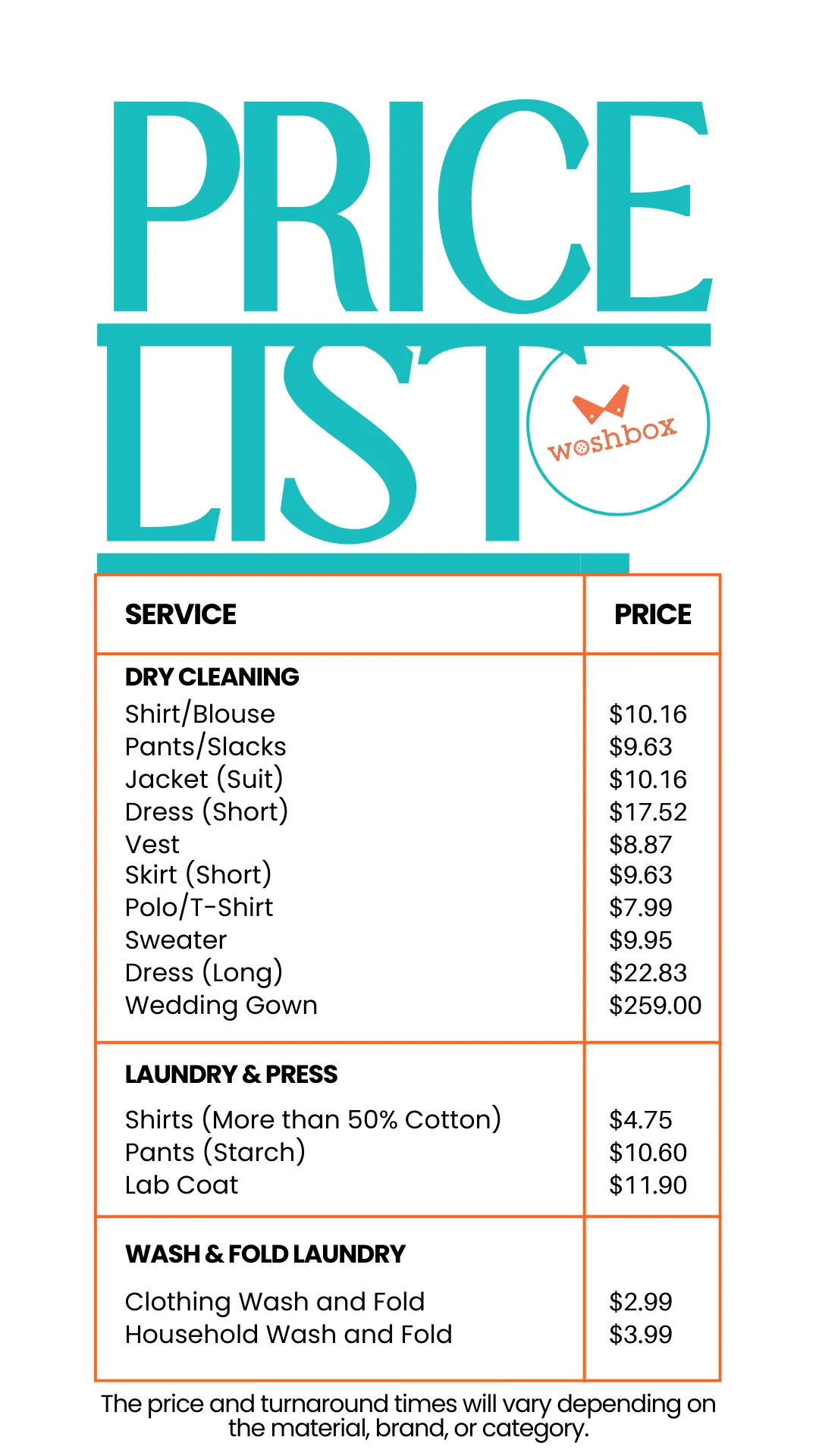 At Woshbox, we believe in transparency. That's why we offer you a clear and detailed price list so you know exactly how much excellence costs. Our commitment is not only to cleanliness, but also to value. We invest in the best technology, processes, and staff training to ensure that every garment receives the premium care it deserves. Check out our prices and see why we are the smart choice for your laundry and dry cleaning needs.